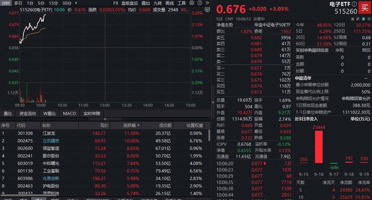 9月22日早盘,消费电子爆发,电子板块表现强劲!中证电子50指数涨超3%,成份股方面,立讯精密领强势涨停,领益智造上涨9.05%,江波龙上涨9.03%。热门ETF方面,重点布局消费电子的电子ETF(515260)场内价格飙涨超3%,单周已有超2.4亿元资金提前加码!